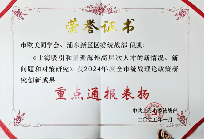 11月22日,上海市委统战部对2025年度全市统战理论政策研究创新成果进行公开表彰。由寰球人才交流中心承担的课题《上海吸引和集聚海外高层次人才的新情况、新问题和对策研究》从众多入围课题中脱颖而出,与邢海燕教授的课题一同受到了通报表扬。